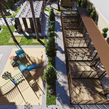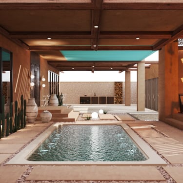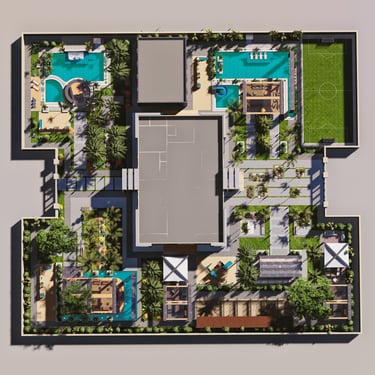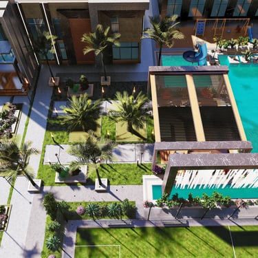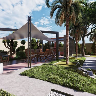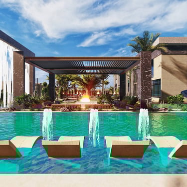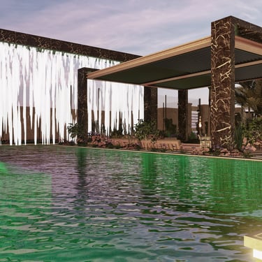 وفي قسم العوائل قام الفريق بعمل مسبحين احدهما للاطفال مع اطلالة كاملة من المنزل على المسبح ليتسنى للعائلة مراقبة الاطفال اثناء السباحة بكل يُسر وسهولة , كما قمنا بتصميم مسبح خاص للسيدات يتوسطه جلسة خاصة ومنطقة للشواء بالاضافة الى المسطحات الخضراء ومناطق الترويش بجوار المسابح .