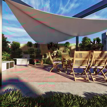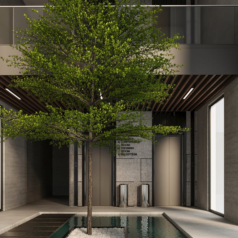 حيث تم تصميم مدخل العمارة بشكل انيق وارتفاع فريد ( DUPPLE HIGHT ) ليمنح المدخل فخامة فريدة ومميزة , كما تم تصميم مسطح مائي بسيط يتوسطه شجرة ليُمنح المدخل طراز فندقي , كما تم استغلال منطقة الروف بعمل نادي رياضي خاص ومنطقة جلوس خارجية ومنطقة شواء ليتمتع بها السكان كقيمة مضافة للمبنى .